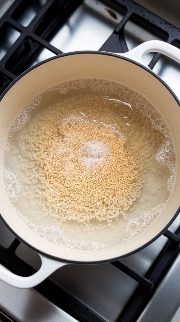 Rinse 1 cup quinoa under cold water. Add it to a medium pot with 2 cups water and a pinch of salt. Bring to a boil, then cover and reduce to low. Cook for 15 minutes until fluffy.