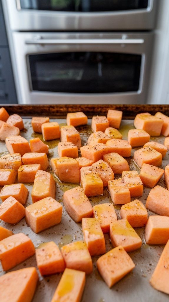 Toss 2 medium diced sweet potatoes with 1 tablespoon olive oil, ½ teaspoon salt, and ¼ teaspoon black pepper. Spread on a baking sheet and roast at 400°F for 25 minutes until golden.