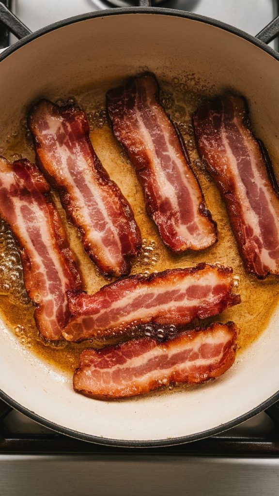 Cook 6 slices of thick-cut bacon in a large pot over medium heat until crispy, about 8 minutes. Remove the bacon, crumble it, and set aside. Leave about 2 tablespoons of bacon fat in the pot.