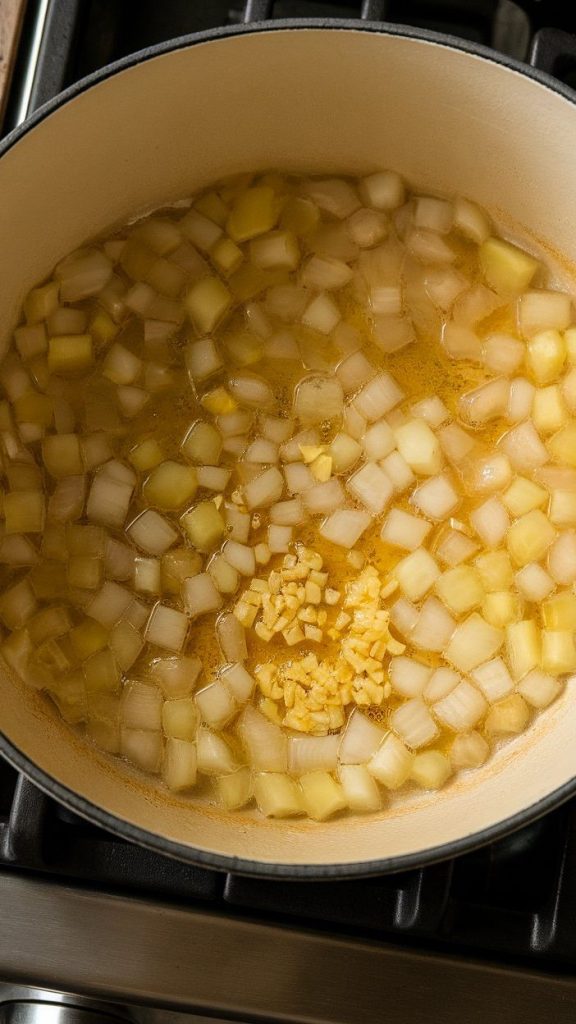 Add 1 small diced yellow onion and 3 cloves minced garlic to the bacon fat. Cook until soft and fragrant, about 3 minutes.