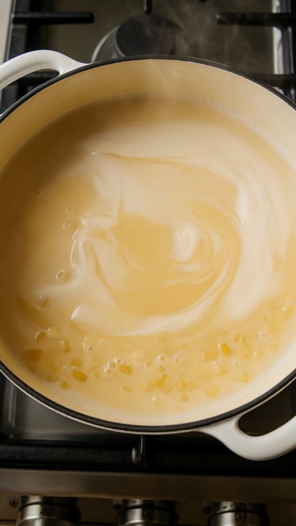 Slowly whisk in 4 cups chicken broth, 2 cups whole milk, and 1 cup heavy cream until smooth. Bring to a gentle simmer.