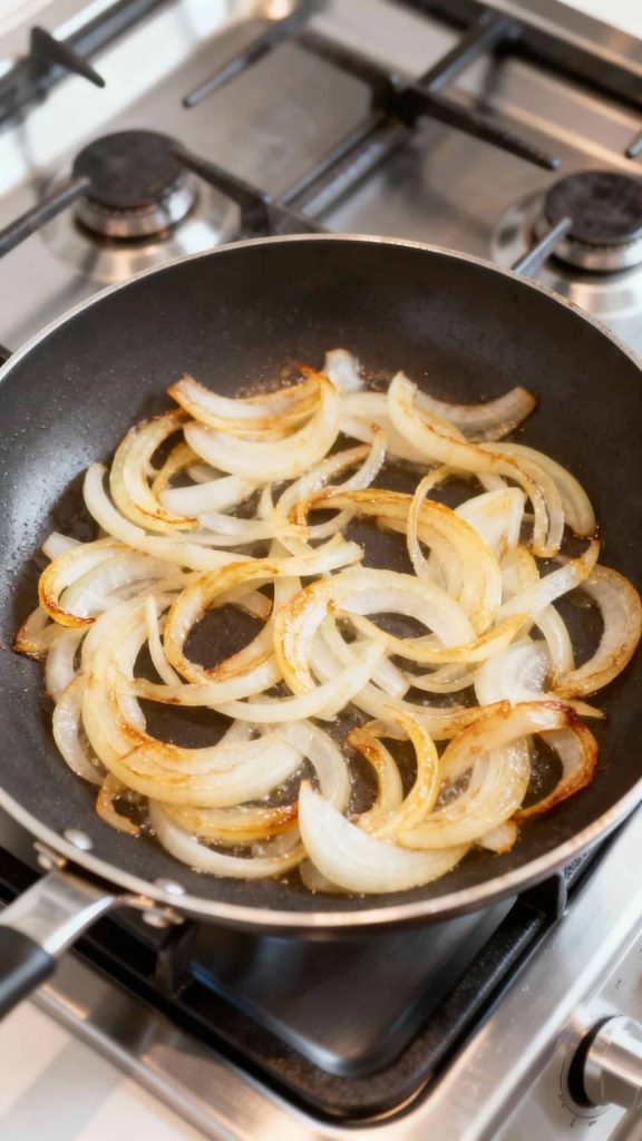 In the same skillet, add thinly sliced onion and cook over medium heat for 10 minutes, stirring often, until soft and golden.