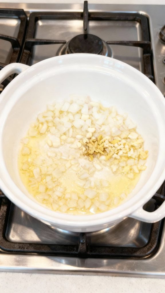 Heat sesame oil and olive oil in a soup pot over medium heat. Add the diced onion, minced garlic, and minced ginger. Sauté for 3–4 minutes until everything is soft and fragrant.