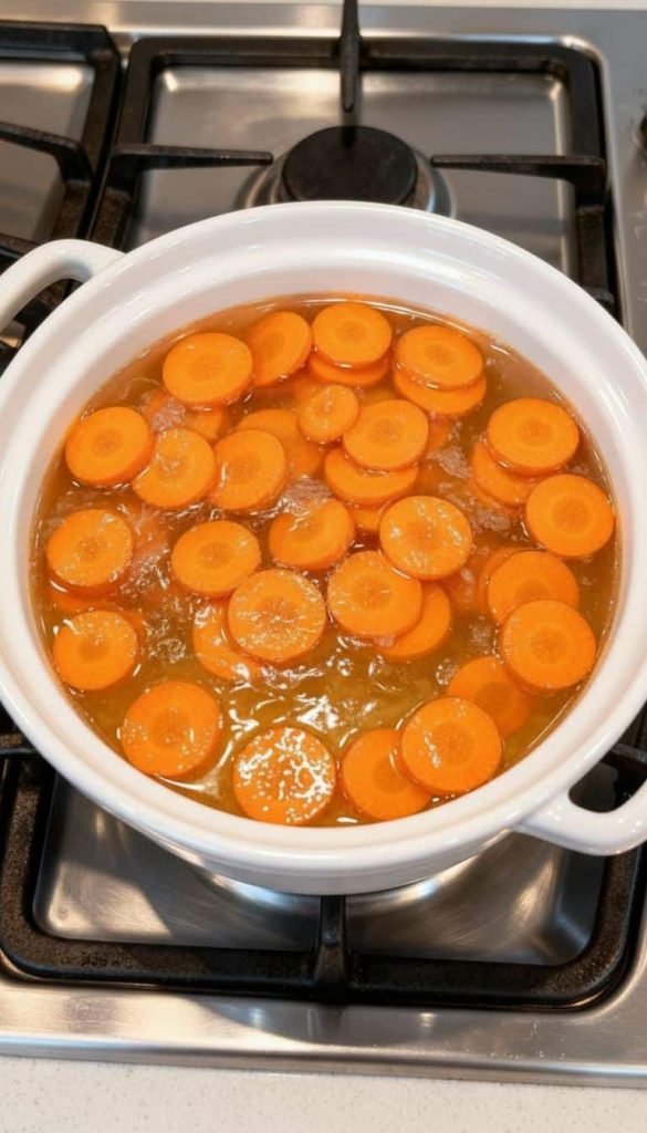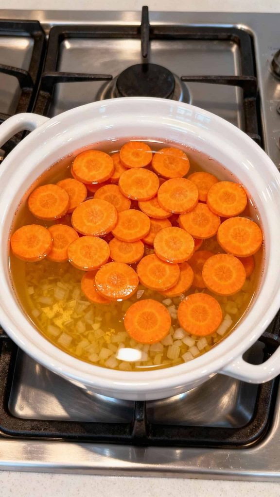 Toss in the carrot slices and pour in the chicken broth and water. Bring it all to a simmer and let it cook for 5–6 minutes until carrots are tender.