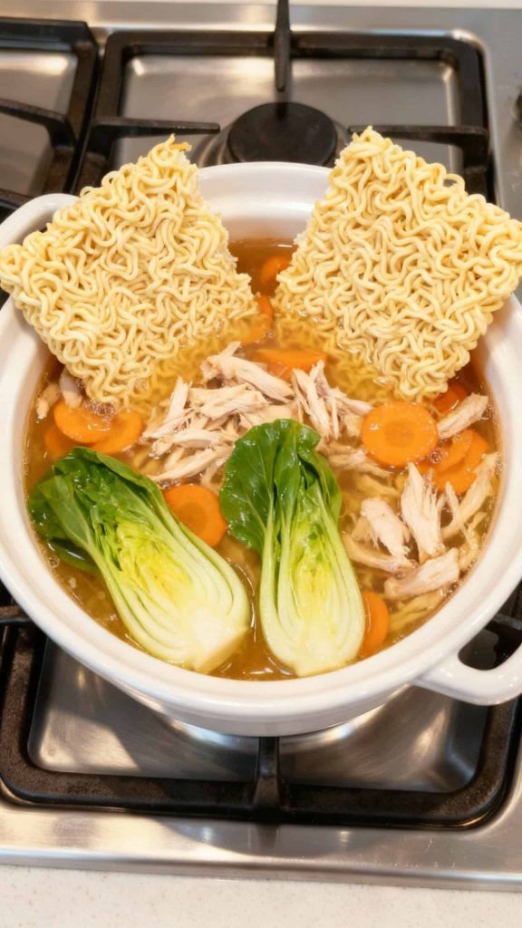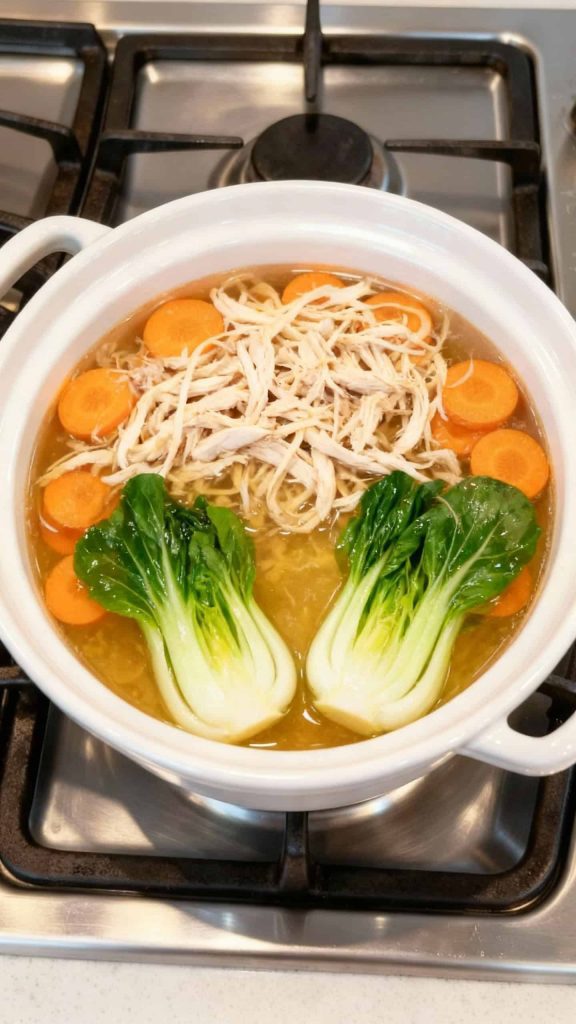 Add the shredded chicken and halved bok choy into the pot. Let it simmer another 3–4 minutes until bok choy is just tender.