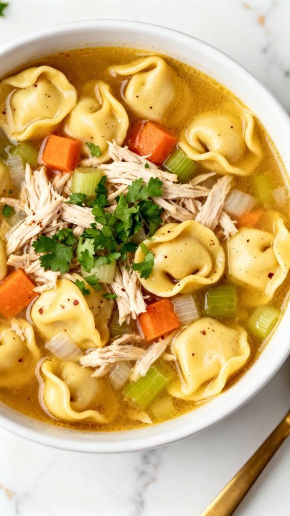 This is a warm, inviting soup with plump tortellini and juicy chicken in a rich broth with herbs and vegetables. The pasta adds a fun, satisfying texture that makes this feel like a full meal in a bowl. You’ll enjoy how the flavors come together quickly, making it a great choice for weeknight dinners. It’s easy to tailor with your favorite greens or veggies, too, so you can make it your own.