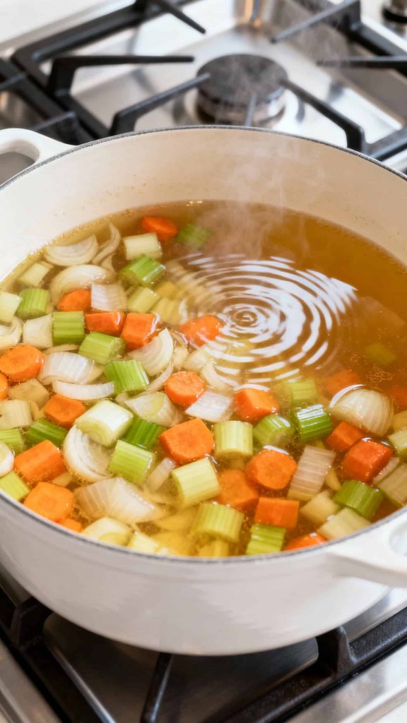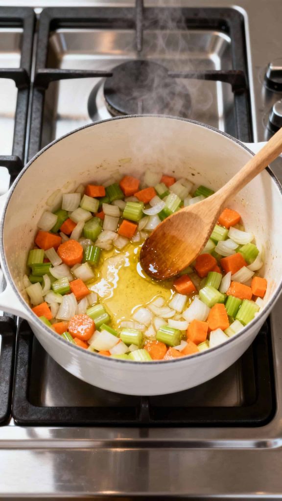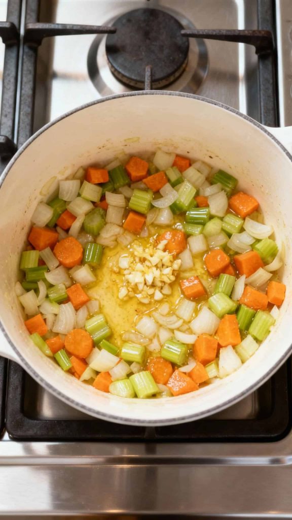 Heat 1 tablespoon olive oil in a large soup pot over medium heat. Add 1 diced onion, 2 diced carrots, and 2 diced celery stalks. Cook for 5–7 minutes, stirring often, until veggies are soft.