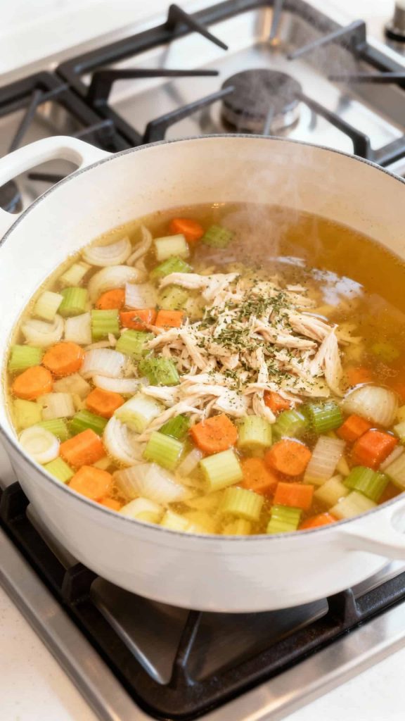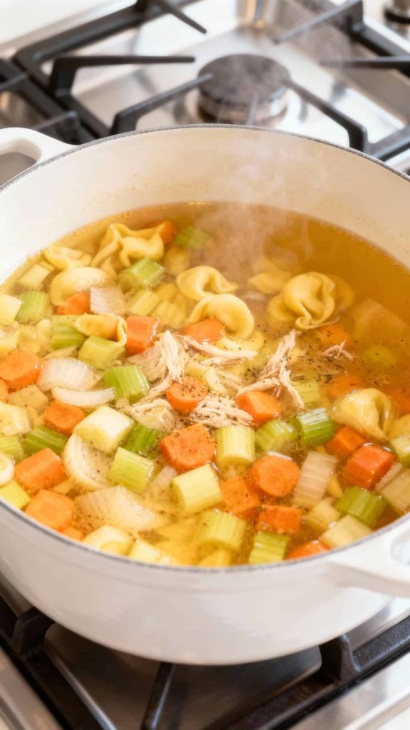 Simmering the broth after adding the chicken and seasoning helps all the flavors blend and deepen. Adding the tortellini last keeps them from getting mushy. The starch from the pasta slightly thickens the broth, giving it a cozy texture.