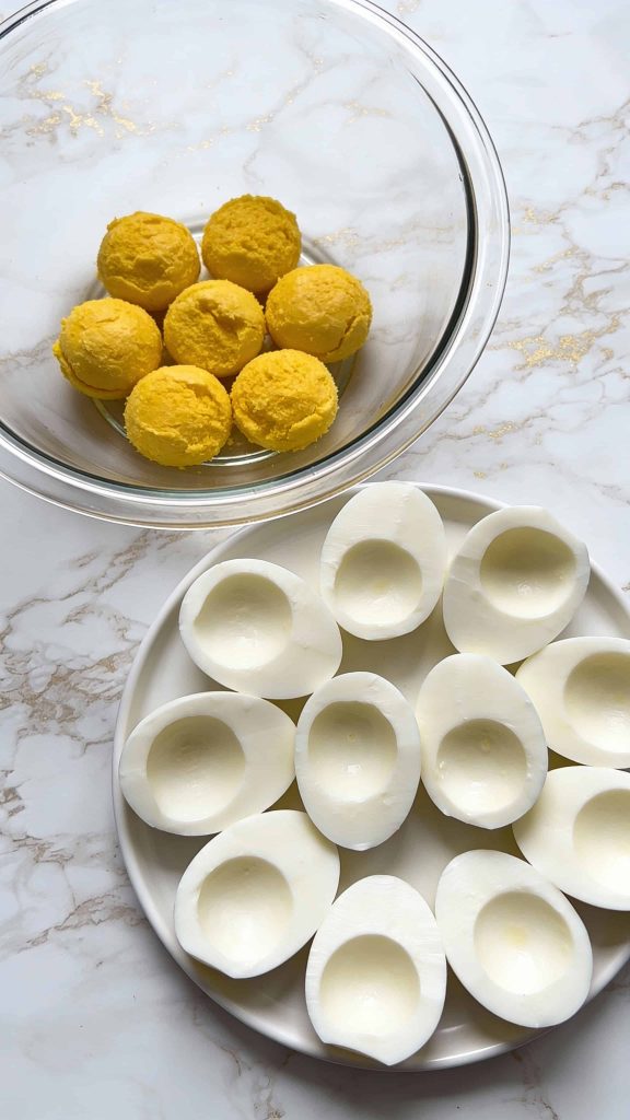 Spoon or pipe the yolk mixture into the egg whites. Try to divide evenly between all 12 halves.