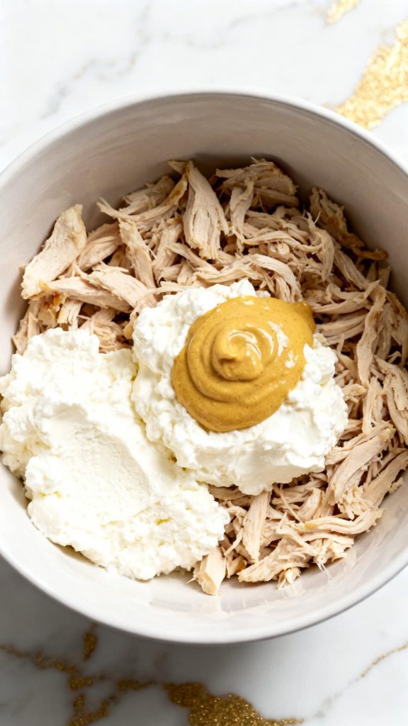 In a mixing bowl, add 2 cups shredded chicken, 1 cup cottage cheese, 1 tablespoon Dijon mustard, and 1 tablespoon lemon juice.