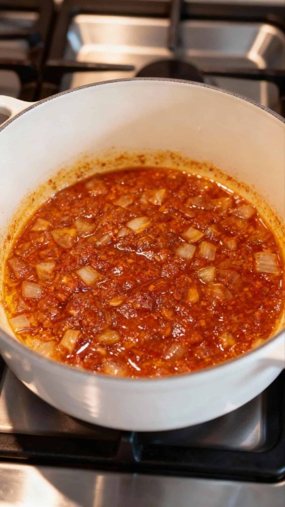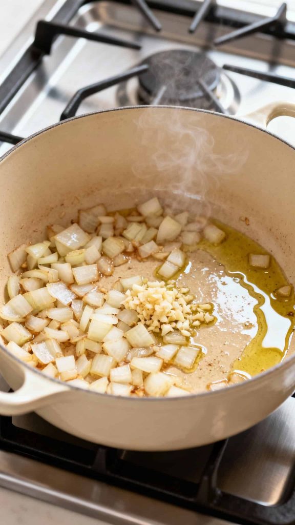 Heat 1 tablespoon olive oil in a large soup pot over medium heat. Add 1 diced onion and cook for 4–5 minutes until soft. Stir in 3 minced garlic cloves and cook 1 more minute.