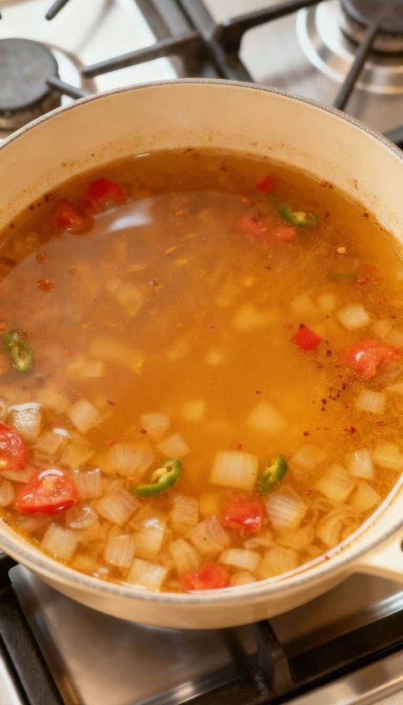 Pour in 4 cups chicken broth and 1 (10 oz) can Rotel. Stir to combine. Bring to a simmer.