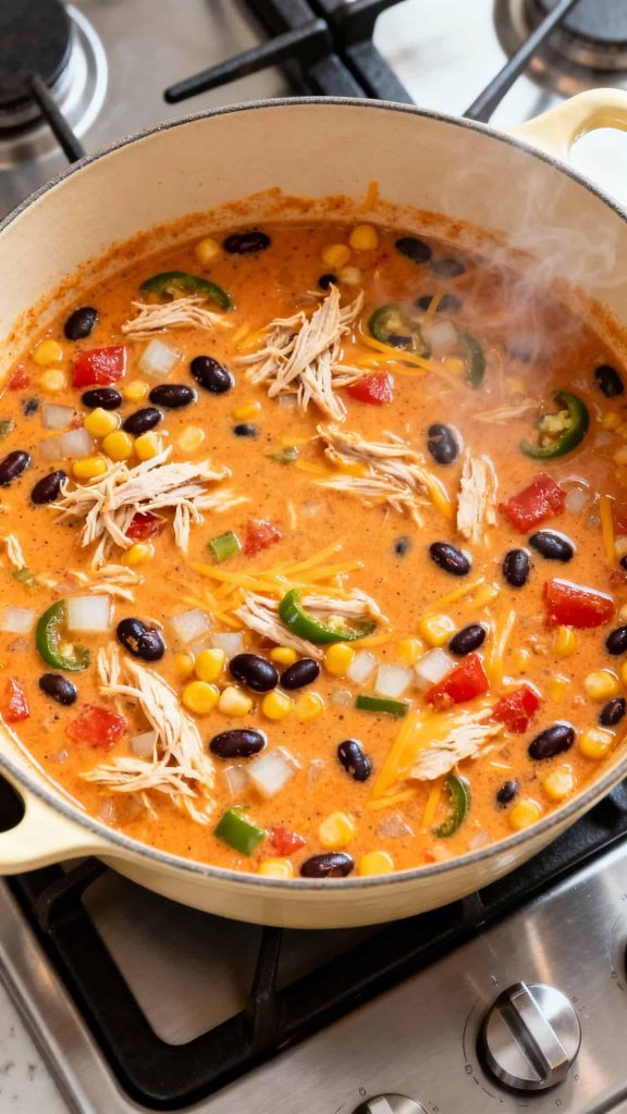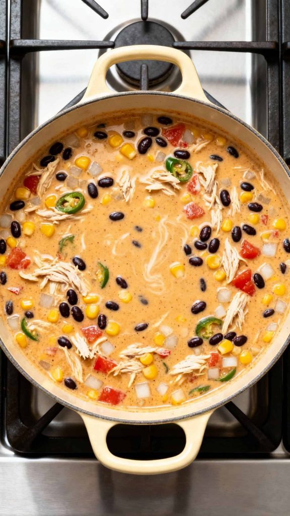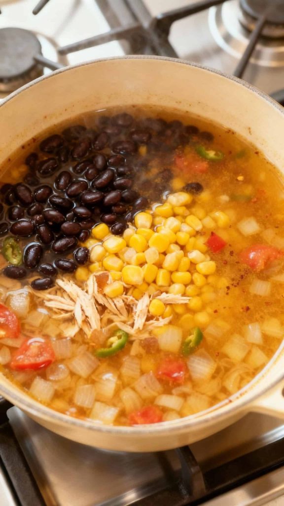 Stir in 1 (15 oz) can black beans (drained and rinsed), 1 cup frozen corn, and 2 cups shredded cooked chicken. Let simmer 10 minutes.