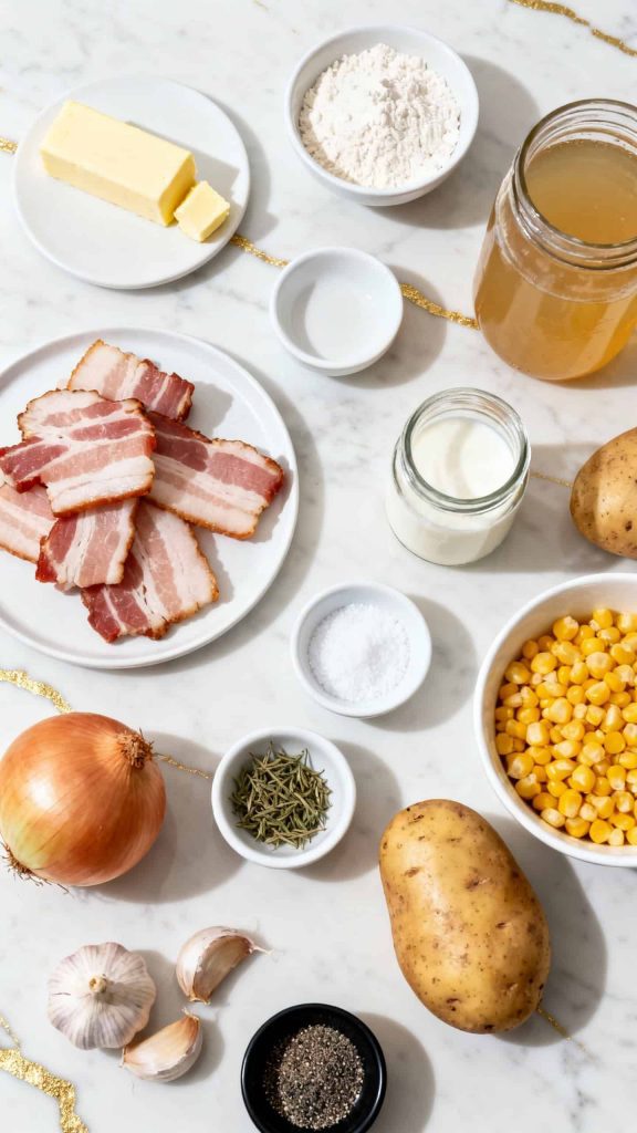 Corn starches naturally thicken when simmered, so when paired with potatoes (which release starch) and flour, it creates a creamy texture without needing cream cheese or heavy cream. The bacon fat adds deep flavor, and sautéing the onions and garlic in that base makes every bite more savory. Half-and-half keeps it rich but not too heavy.