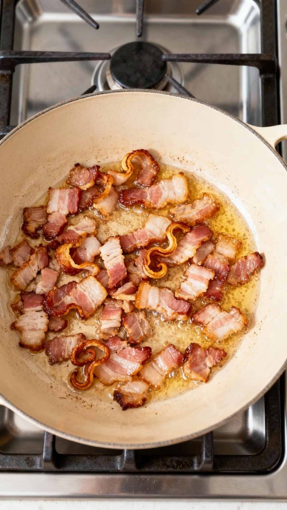 Add the chopped bacon to a large pot and cook over medium heat until crispy. Stir often. Once browned, remove with a slotted spoon and set aside. Leave about 1 tablespoon of bacon fat in the pot.