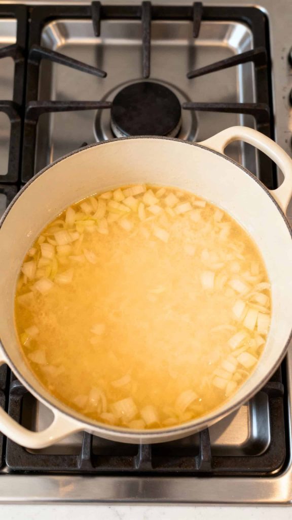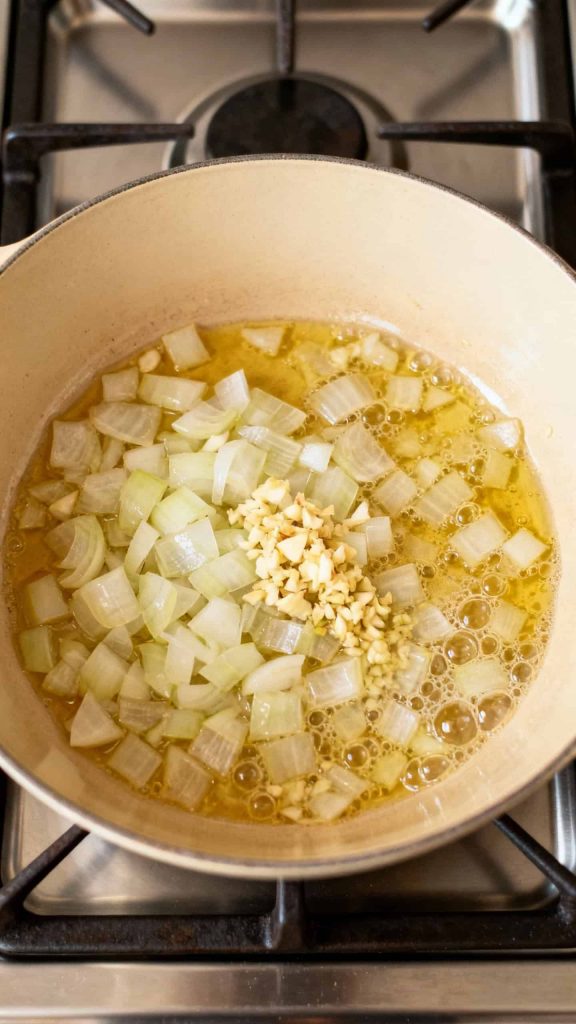 Add butter to the bacon fat in the pot. Once melted, stir in the diced onion and cook for 4–5 minutes until soft. Add the minced garlic and cook 1 minute more.