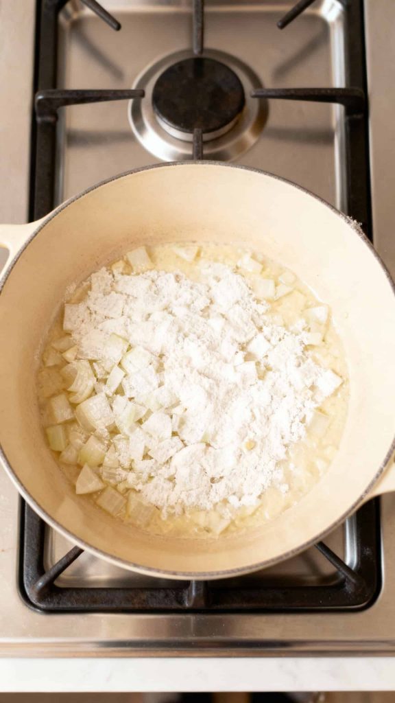 Sprinkle in the flour and stir constantly for about 1 minute to cook out the raw taste. It’ll form a thick paste with the veggies.
