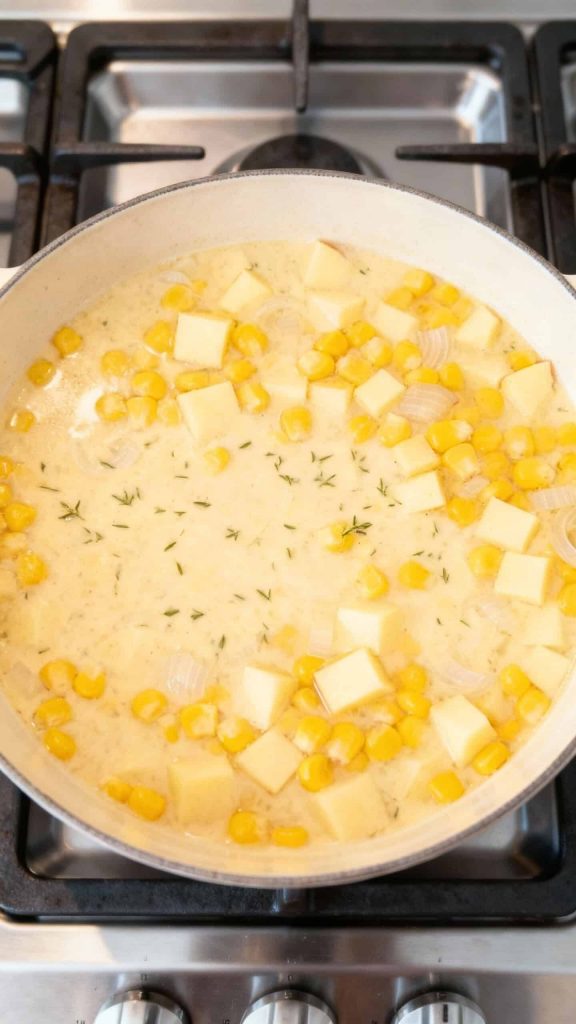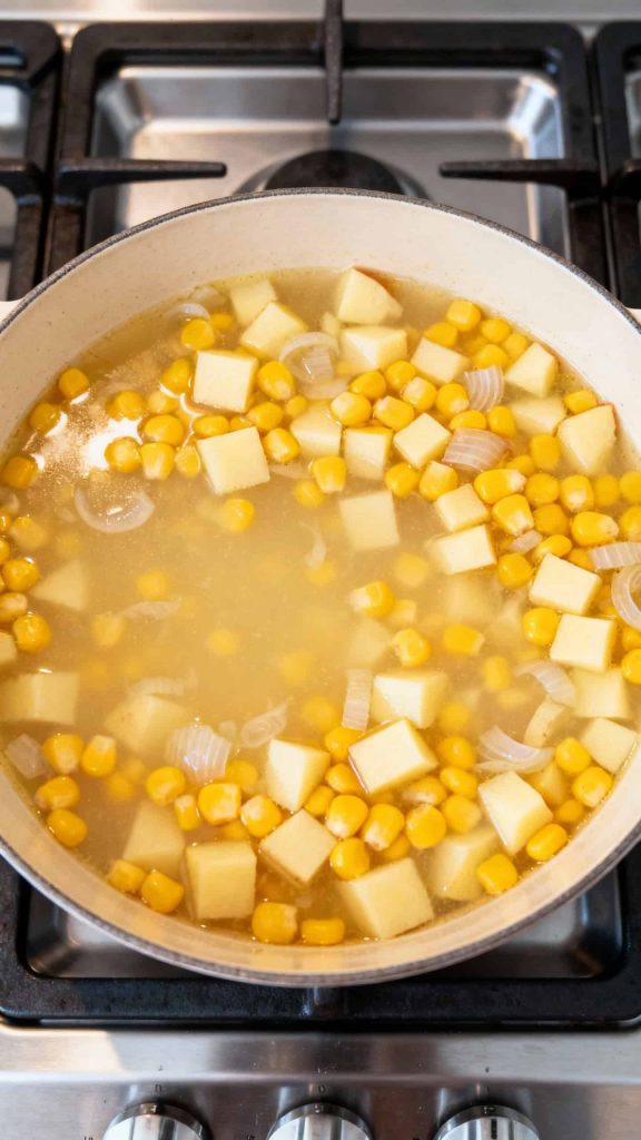 Stir in the corn and diced potatoes. Bring everything to a low boil, then reduce to a simmer. Cover and cook 15–20 minutes, or until potatoes are soft.
