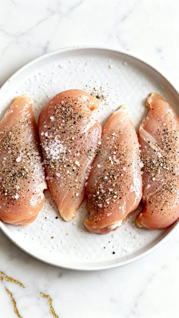 Season 4 boneless skinless chicken breasts with 1 teaspoon salt ½ teaspoon black pepper and 1 teaspoon garlic powder on both sides