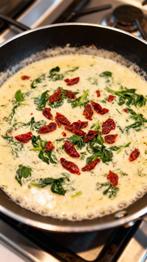 Stir in ⅓ cup chopped sun dried tomatoes and 2 cups fresh spinach Cook for 1 to 2 minutes until spinach wilts