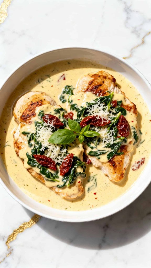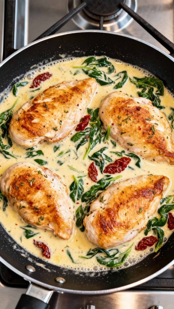 This creamy Tuscan chicken is one of those recipes that feels fancy but is secretly really easy to make. Juicy chicken in a garlic parmesan cream sauce loaded with sun dried tomatoes and spinach. It’s rich cozy and tastes like something from a restaurant. Perfect with pasta rice or even mashed potatoes.