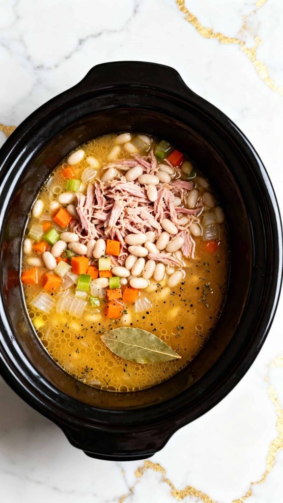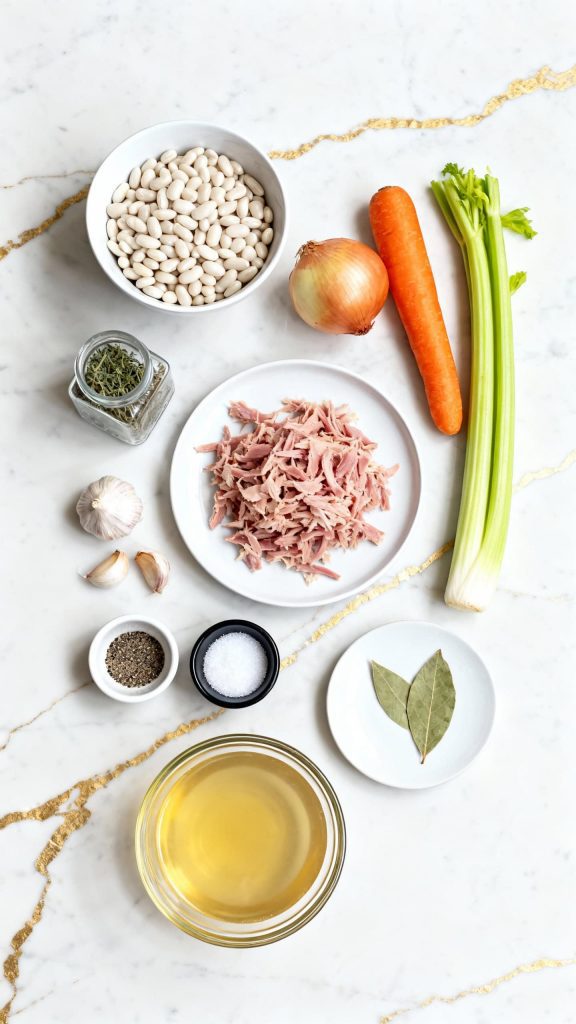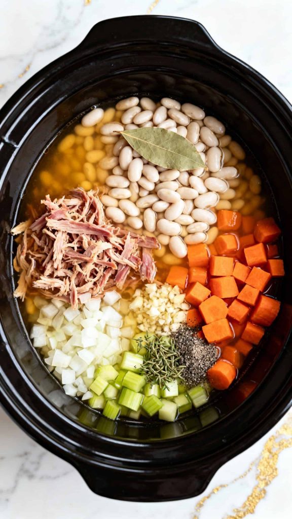 Rinsed beans, 2 cups cooked ham (shredded), 1 diced onion, 2 diced carrots, 2 minced garlic cloves, 1 tsp salt, ½ tsp black pepper, 1 tsp dried thyme, 1 bay leaf, 6 cups chicken broth