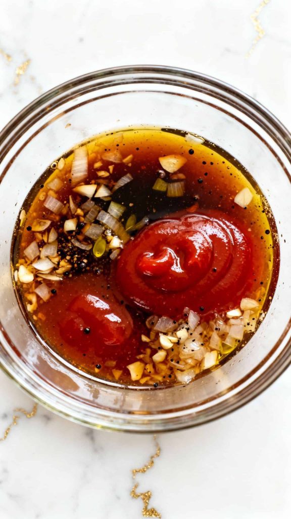 In a medium mixing bowl, combine 1/2 cup honey, 1/2 cup low-sodium soy sauce, 1/4 cup ketchup, 1 tablespoon olive oil, 5 cloves minced garlic, 1/2 teaspoon black pepper, and 1 finely chopped onion. Stir well until smooth.