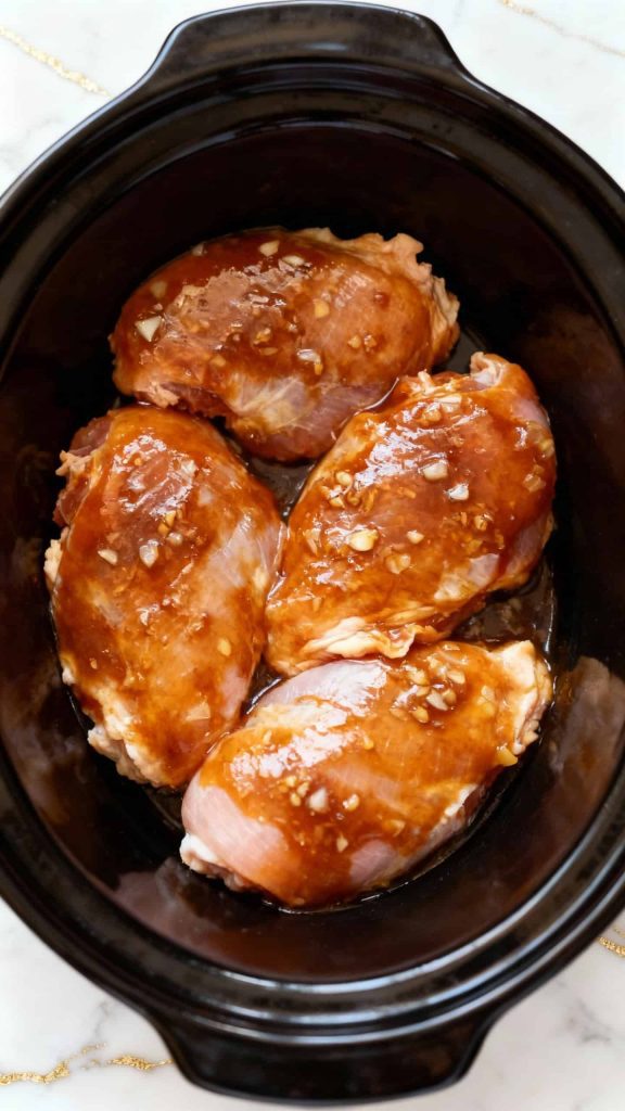 Pour the mixed honey garlic sauce evenly over the chicken in the crockpot, covering all pieces.