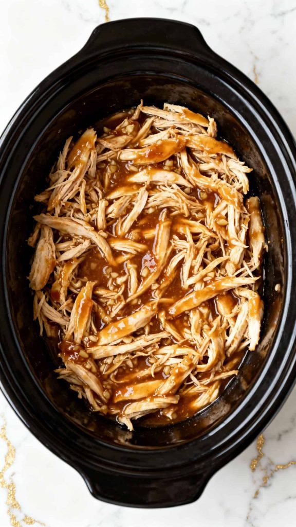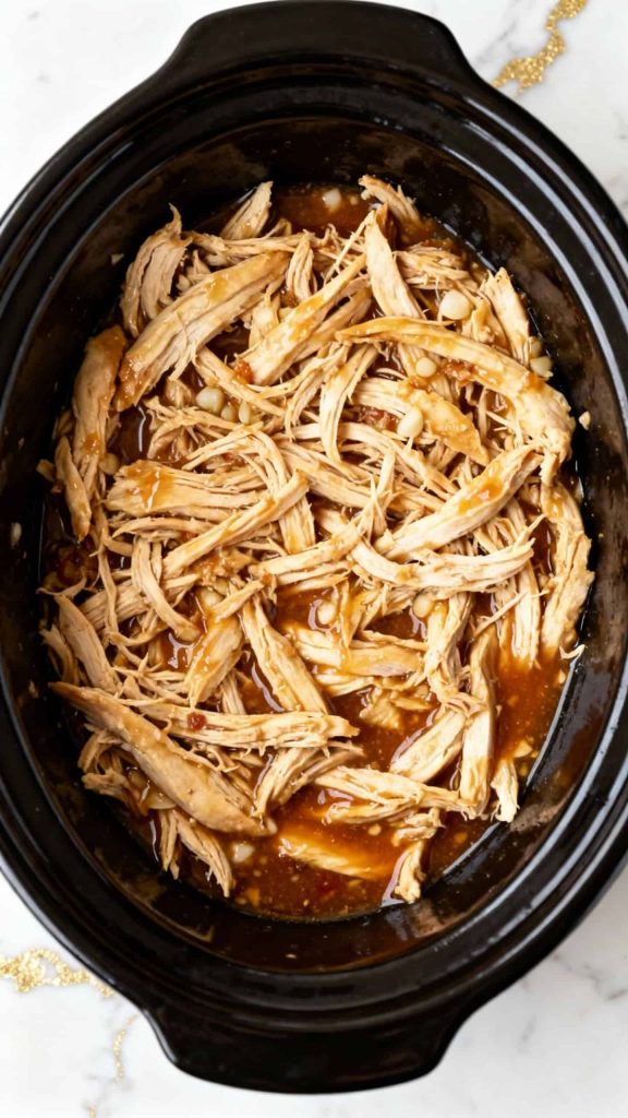 Once cooked, remove the lid and use two forks to shred the chicken directly in the crockpot. Mix it well so it soaks up all the sauce.