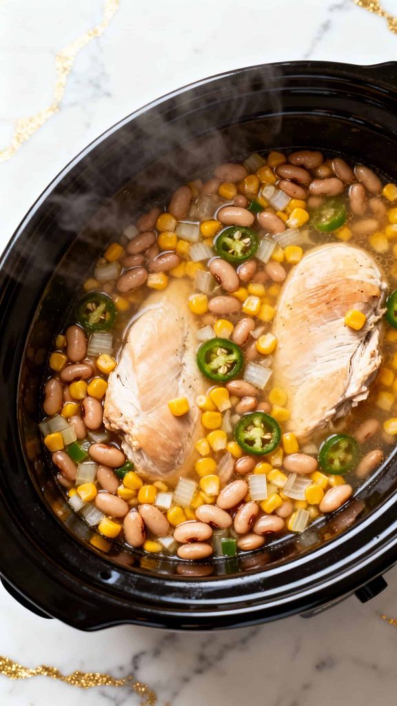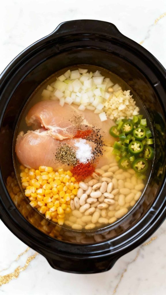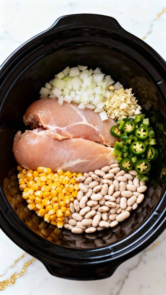 Place 1.5 lbs boneless skinless chicken breasts in the crockpot. Add 1 diced onion, 3 cloves minced garlic, 1 (15 oz) can of corn (drained), 1 (4 oz) can diced green chiles, and both drained beans (15 oz each of great northern and cannellini).