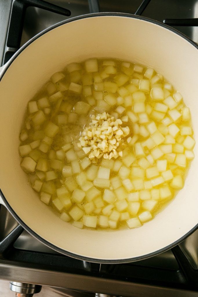 Heat 2 tablespoons of olive oil in a large soup pot over medium heat. Add 1 diced yellow onion and cook for 3–4 minutes until soft. Stir in 3 minced garlic cloves and cook for another 30 seconds.