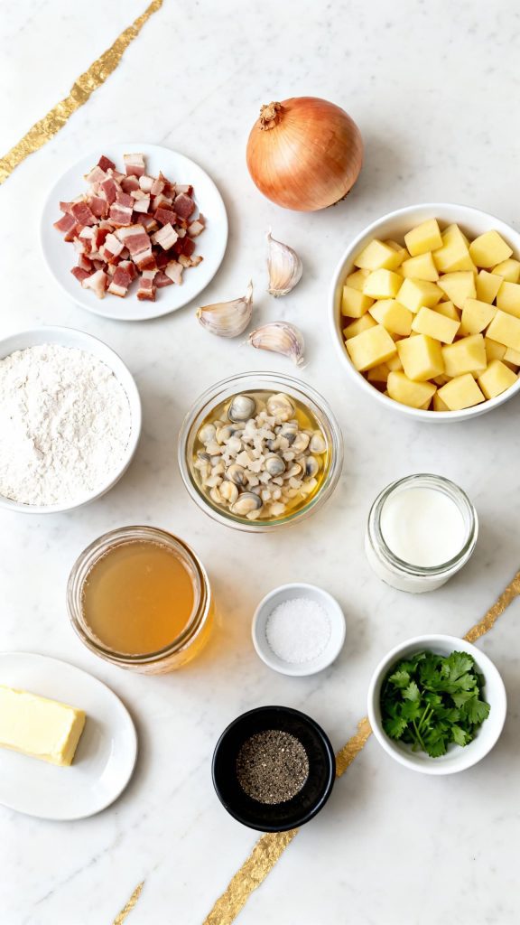 The flour and bacon fat make a quick roux, thickening the chowder. The starch from the potatoes adds body, and the clam juice brings deep seafood flavor fast. Heavy cream makes it rich without curdling.