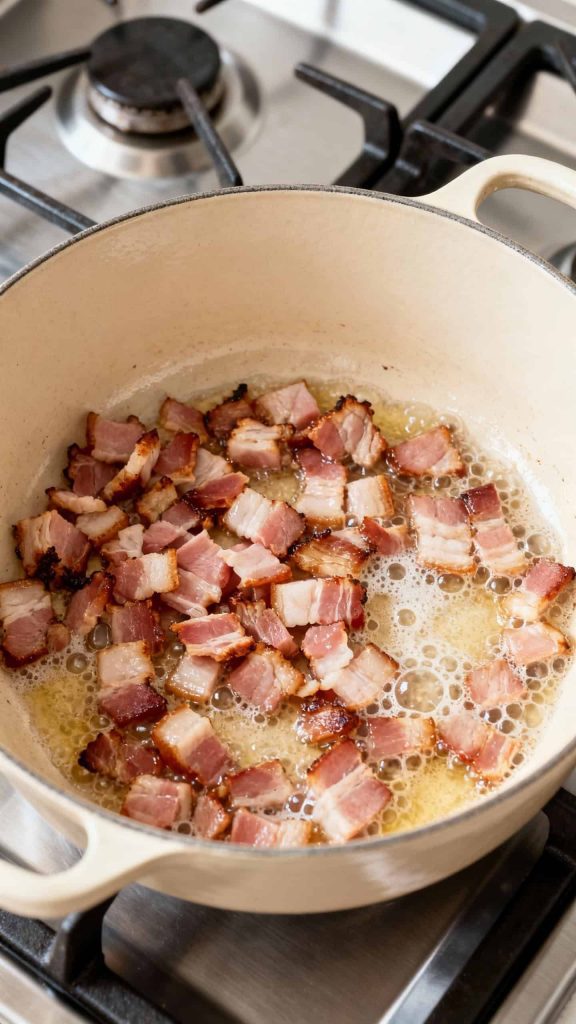 Cook 4 slices of chopped bacon in a large soup pot over medium heat until crispy, about 5-6 minutes. Remove bacon and set aside. Leave about 2 tablespoons of bacon fat in the pot.
