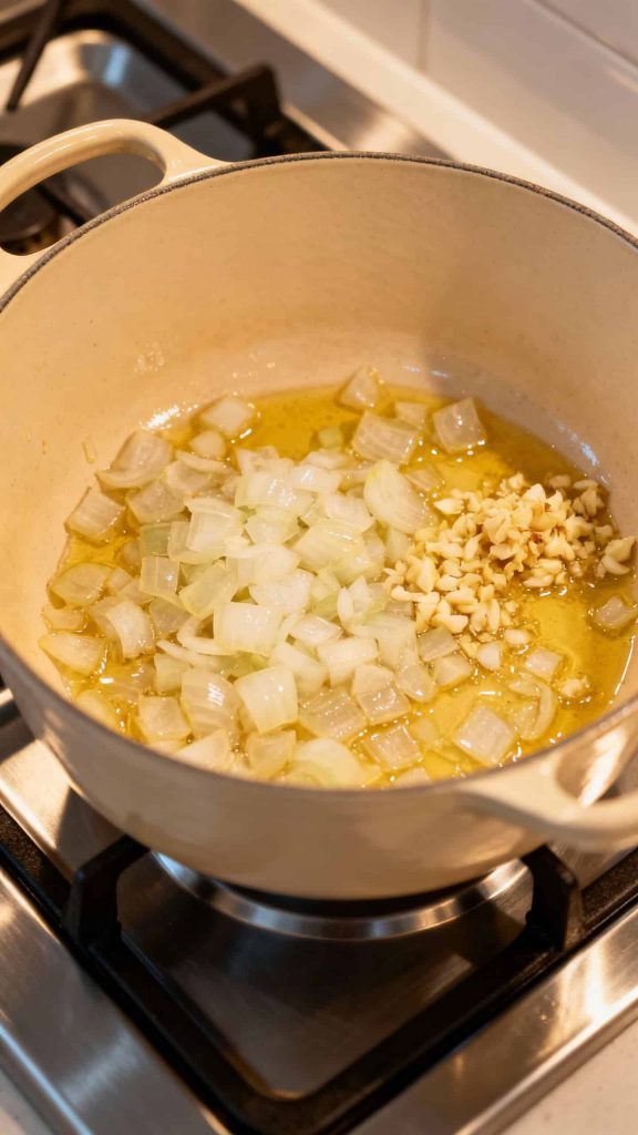 Add 1 small diced onion and 2 cloves of minced garlic to the bacon fat. Cook for 2-3 minutes, stirring, until onion is soft and translucent.