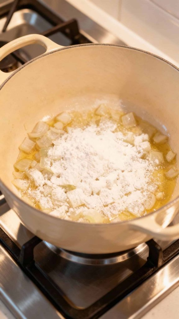 Sprinkle in 2 tablespoons of all-purpose flour. Stir constantly for 1 minute to cook off the flour taste.