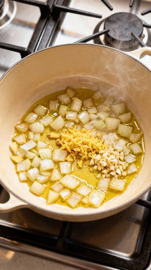 Heat 1 tablespoon olive oil in a large pot over medium heat. Add 1 diced onion, 1 tablespoon grated ginger, and 3 minced garlic cloves. Cook for 3–4 minutes until soft and fragrant.