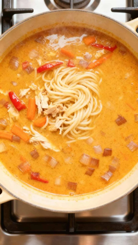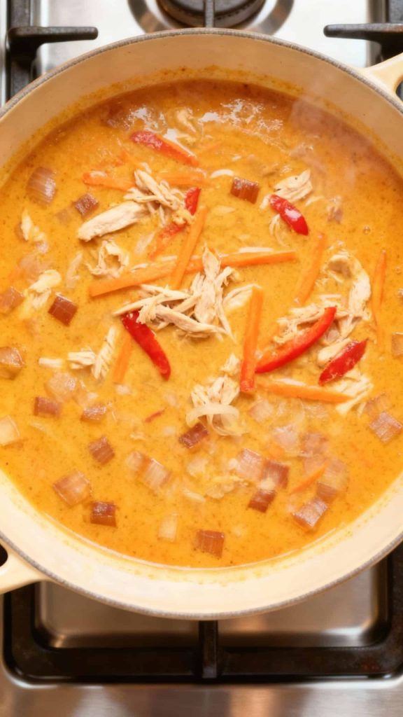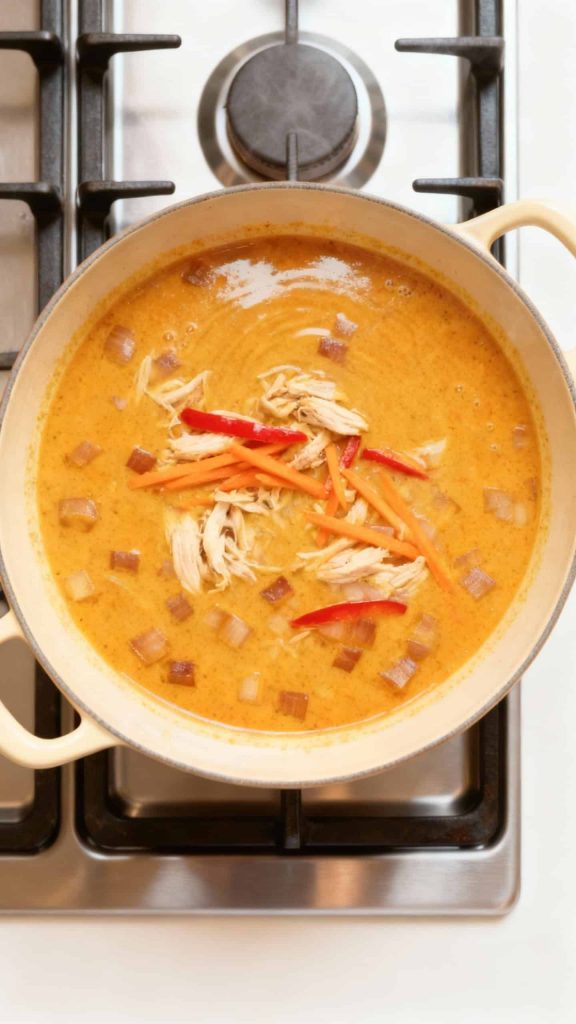 Stir in 2 cups shredded cooked chicken, 1 thinly sliced red bell pepper, and 1 cup matchstick carrots. Let simmer for 5–7 minutes until vegetables are tender.