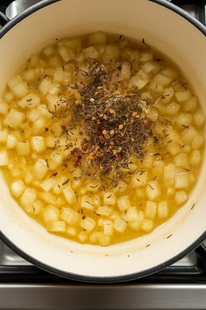 Stir in 1 teaspoon dried thyme and 1/2 teaspoon red pepper flakes (if using). Cook for 30 seconds to bloom the spices.