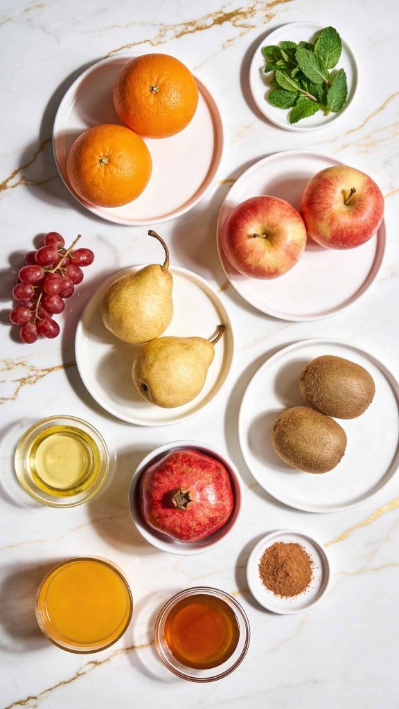 Citrus and honey create a natural acidic and sweet balance that keeps apples and pears from browning, while enhancing the flavors of the fruit. The cinnamon adds a gentle warmth that feels just right in winter. Pomegranate seeds give crunch, and mint lifts the whole salad.