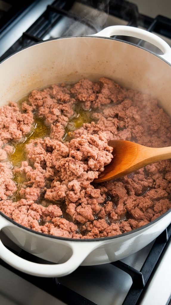 Heat 1 tbsp olive oil in a large pot over medium heat. Add 1 lb lean ground turkey. Break it apart with a wooden spoon and cook until browned, about 6–7 minutes.