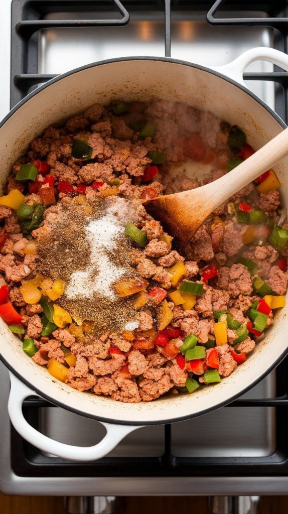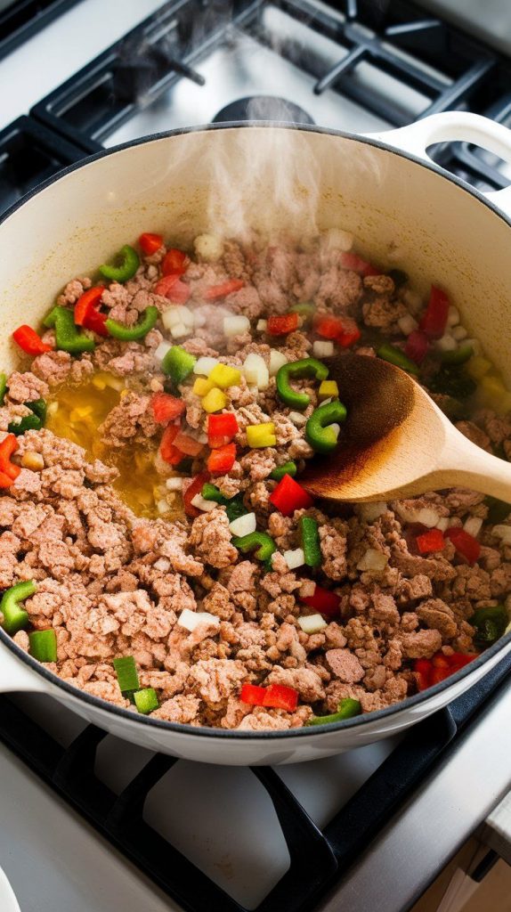 Stir in 1 large diced onion, 3 diced bell peppers (red, green, yellow), and 4 minced garlic cloves. Cook for 5 minutes until softened.