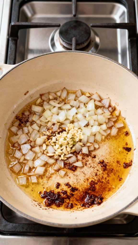 In the same pot, reduce heat to medium. Add 1 diced onion and 3 minced garlic cloves. Sauté for 2–3 minutes until softened and fragrant
