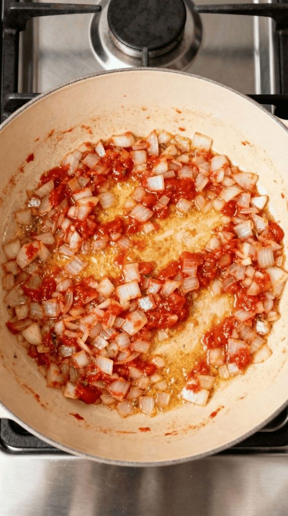 Add 2 tbsp tomato paste and stir into the onion mixture. Cook for 1–2 minutes to darken the color and deepen flavor