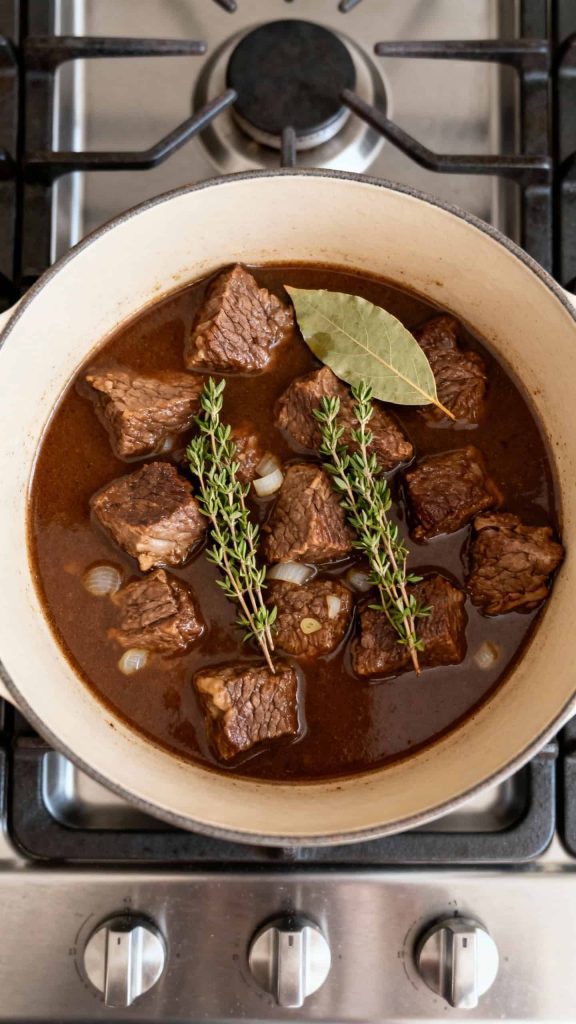 Return browned beef to the pot. Add 2 sprigs fresh thyme and 1 bay leaf. Bring to a gentle simmer