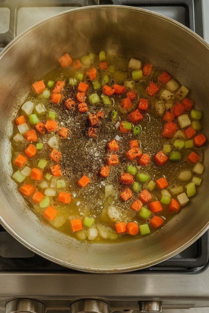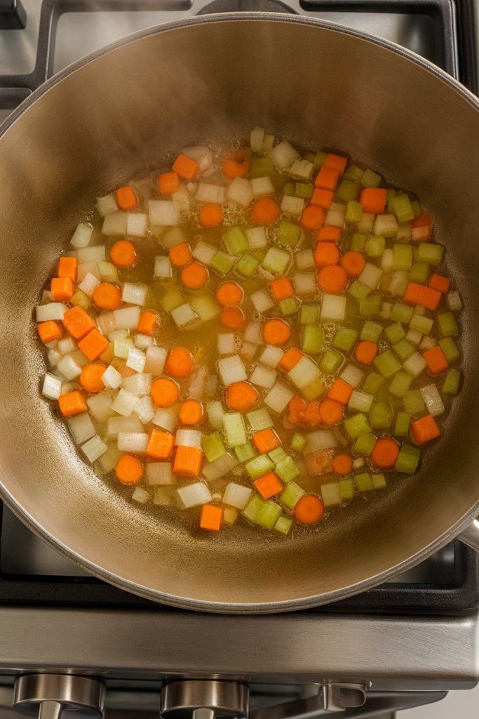 Heat 1 tablespoon olive oil in a medium soup pot over medium heat. Add 1 small diced yellow onion, 3 minced garlic cloves, 2 diced carrots, and 2 diced celery stalks. Cook for 5-6 minutes until the veggies are softened and fragrant.