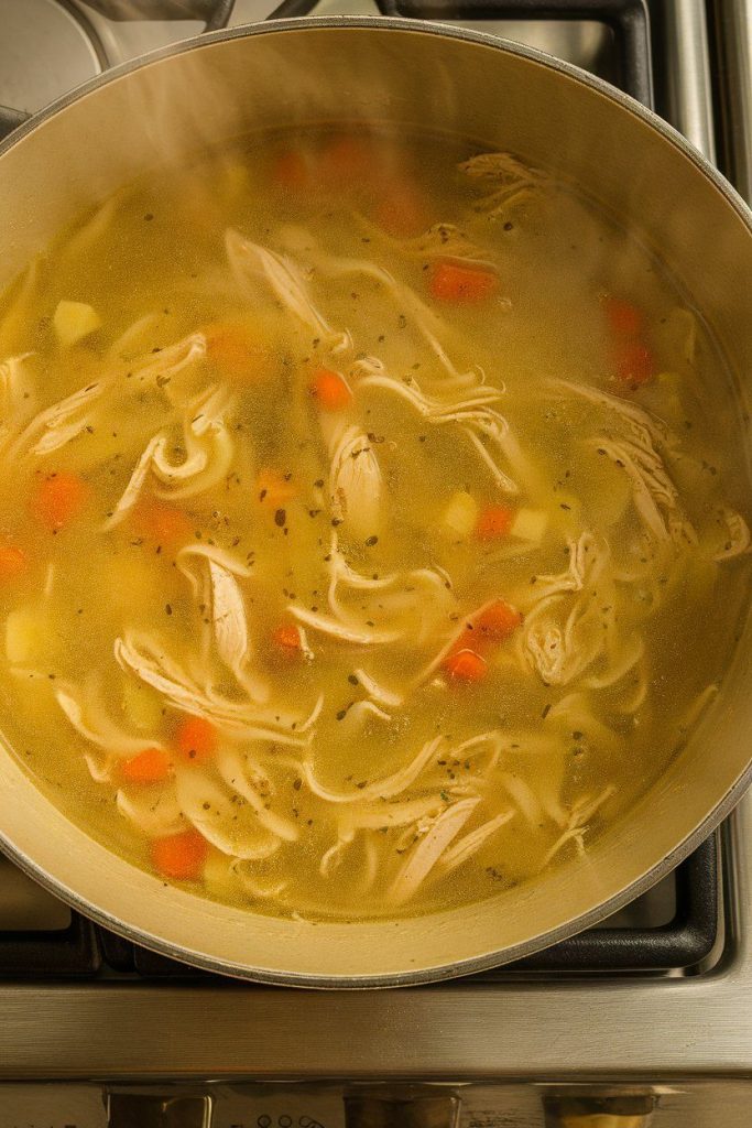 Pour in 6 cups low-sodium chicken broth and stir in 2 cups shredded cooked chicken. Bring to a gentle simmer for 10 minutes.