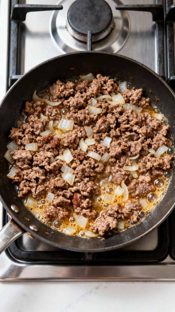 Heat a large skillet over medium-high heat. Add 1 lb ground beef and 1 diced onion. Cook for 6–7 minutes until beef is browned and onions are soft. Break up beef with a spoon.