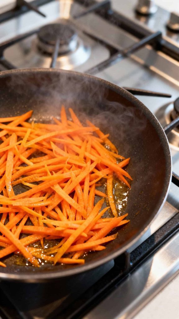 In another pan or push beef to one side, quickly sauté 2 julienned carrots for 2–3 minutes until just tender but still bright.