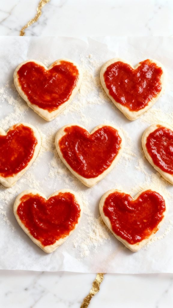 Spoon about 1 teaspoon of pizza sauce onto each mini heart, spreading it gently but leaving a little border around the edges.