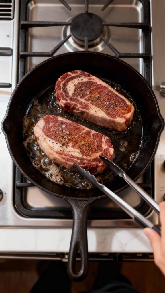 Add the steaks to the hot pan. Press them down gently so they make full contact. Don’t move them. Sear for 3–4 minutes.